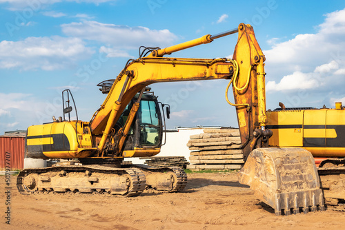 Powerful excavator at a construction site against a blue cloudy sky. Earthmoving construction equipment. Modern building machines.