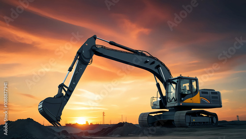 Powerful Excavator in Action at Sunset, Hydraulic Arm Extended Against Fiery Sky, Embodying Industrial Progress and Construction Power.