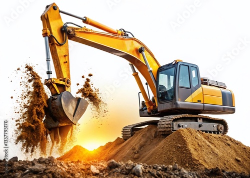 Powerful Excavator in Action, Dynamic Angle, Dirt Flying, White Background - Construction Stock Photo