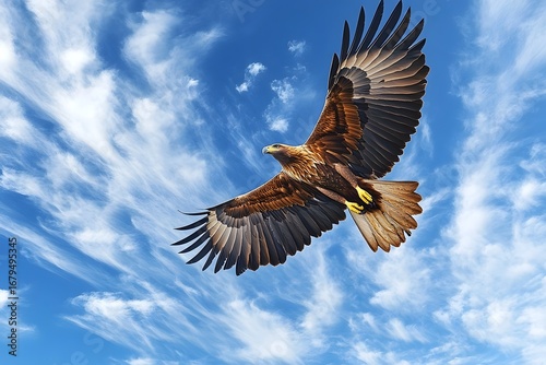 Powerful golden eagle soaring with fox in its talons against dramatic sky