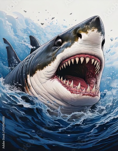 Powerful great white shark emerging from the ocean with jaws wide open, showcasing its sharp teeth in a dramatic and intense marine scene.
