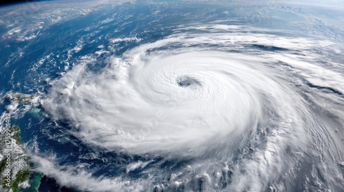 Powerful hurricane swirling over the ocean, visible from above with a well-defined eye and extensive cloud patterns during a clear day