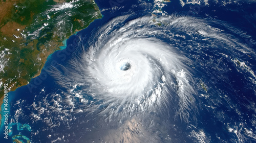 Powerful hurricane swirls over ocean, showcasing dramatic cloud formations and intense weather patterns. vibrant blue waters contrast with storm