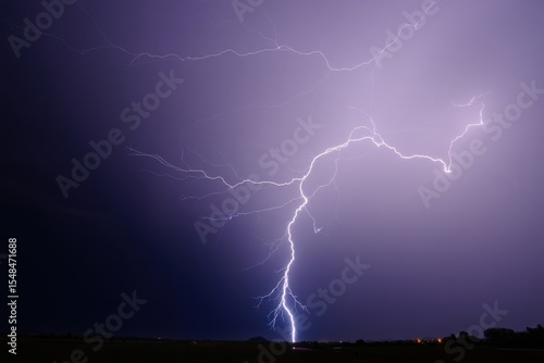 Powerful lightning bolt striking the ground creates a dramatic display of nature's force, illuminating the night landscape during an intense thunderstorm
