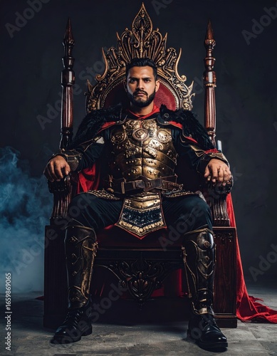 Powerful medieval king sitting on throne with red cape and golden armor