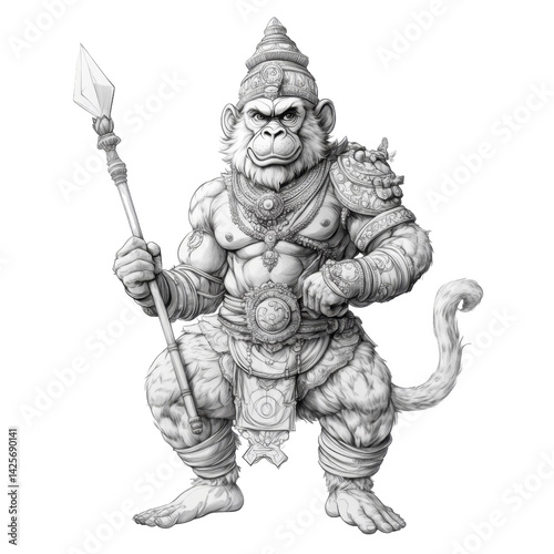 Powerful Monkey God Hanuman Illustration Detailed Pencil Sketch Hindu Deity Warrior Spear