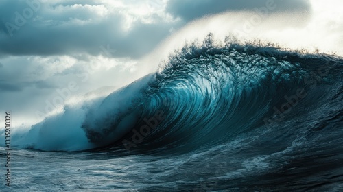 Powerful ocean wave, dramatic sky, crashing, coastal scene, possible use in travel/nature