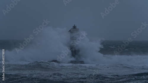Powerful ocean waves smashing into isolated lighthouse during heavy sea storm