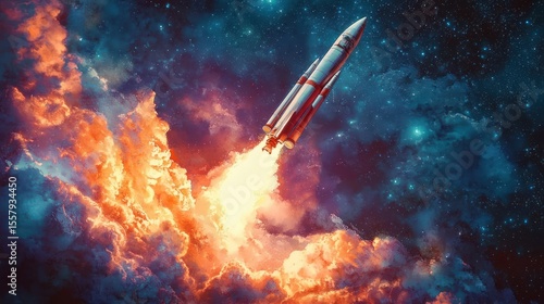 Powerful rocket blasting off through fiery clouds into a star-filled night sky symbolizing exploration and adventure