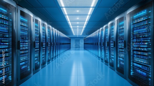 Powerful server unit illuminating a data center with glowing lights powerful