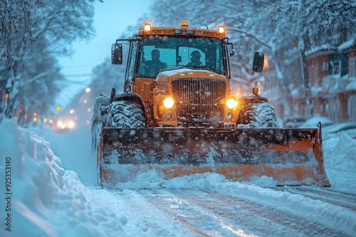 powerful snowplow clearing city streets after blizzard illuminated by warm streetlights against a dark winter sky