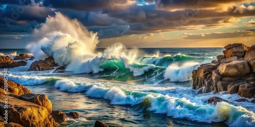 Powerful surf and big waves dominate this dramatic coastal scene, capturing the raw energy of the sea.
