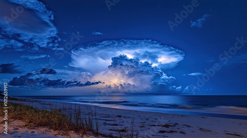 Powerful thunderstorm over an open ocean, dramatic lightning strikes