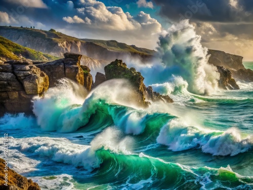 Powerful turquoise waves crash violently against rocky cliffs, sending plumes of spray high into the air as the ocean's fury unleashes its full force.
