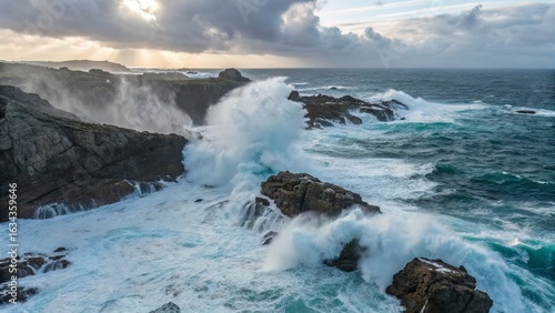 Powerful waves crash on a rocky coastline under a dramatic sky