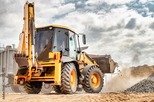 Powerful wheel loader or bulldozer against the sky. Loader transports crushed stone or gravel in a bucket. Powerful modern equipment for earthworks and bulk handling.