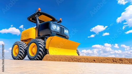 Powerful Yellow and Black Construction Tractor Moving Sand Against Blue Sky