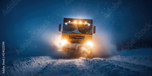 Powerful yellow lorry driving along a snowy road at night, navigating through a blizzard while headlights cutting through the darkness, illuminating the snow covered landscape