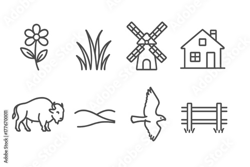 Prairie Line Icons. Line style icons of Flowering Prairie: Blooming Wildflower, Tall Grass, Windmill, Farmhouse, Bison, Rolling
