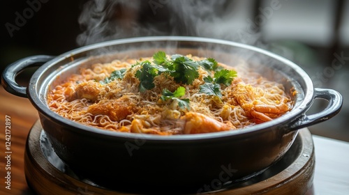 Prawns and crab steamed with vermicelli in a traditional hot pot, garnished with fried garlic and cilantro, steaming hot and ready to enjoy.