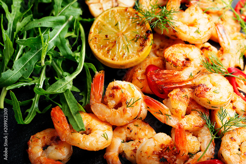 Prawns Shrimps roasted on pan with lemon and garlic on dark rustic background. top view.