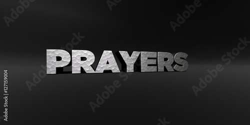 PRAYERS - hammered metal finish text on black studio - 3D rendered royalty free stock photo. This image can be used for an online website banner ad or a print postcard.