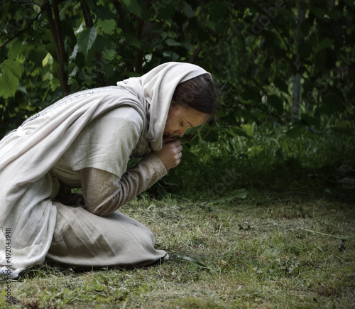 Praying woman on grass lawn
