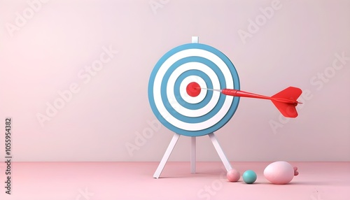 Precision and Success: Red Dart Striking Bullseye on Black and White Dartboard with Turquoise Backdrop
