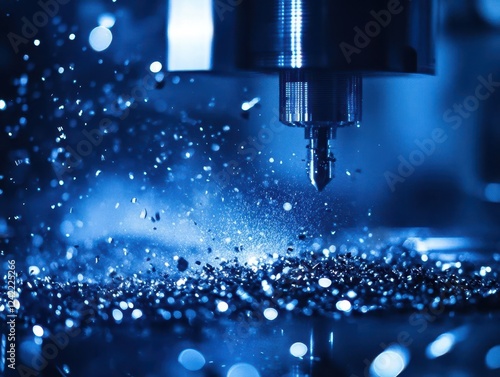 precision cnc machining center with blue led lighting, titanium chips spraying, close-up dramatic shot capturing intricate metalwork details in motion, industrial atmosphere
