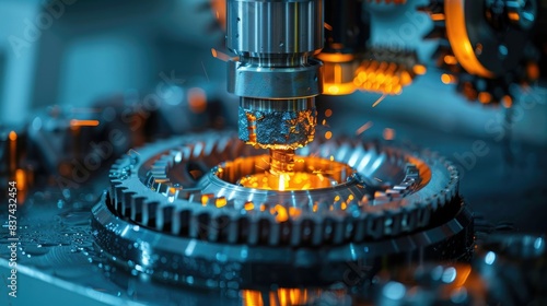 Precision gear manufacturing process showcasing metal machining and intricate engineering with bright sparks and detailed components.