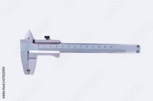 Precision measurement device. Caliper isolated on white background. Metal equipment for engineering work.