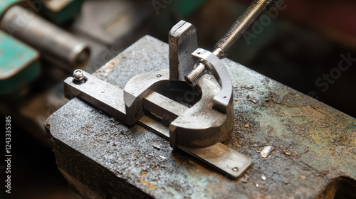 Precision measurement of metal part using skilled technician in workshop. image showcases metal clamp on workbench, highlighting intricate details of measurement process