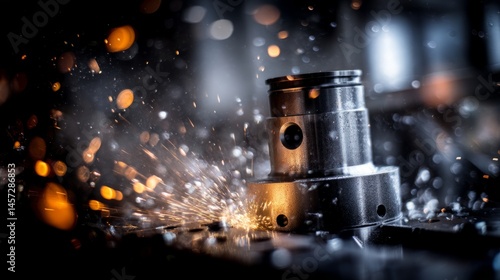 Precision metal component with flying sparks, showcasing industrial craftsmanship and controlled power.