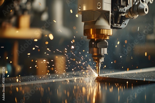 Precision Metal Cutting Machine in Action, Showcasing High-Tech Equipment and Spark Emission during the Metal Processing Process in a Modern Workshop Environment