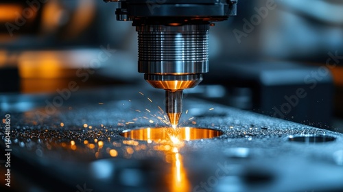Precision metal cutting operation. A close-up view of a machine cutting through a metal plate with sparks