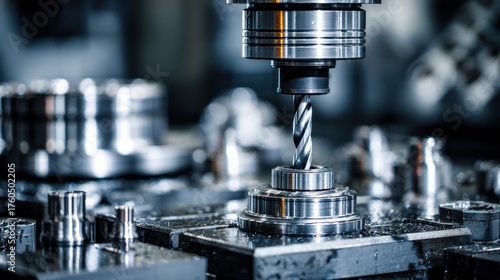 Precision Metalworking Process in Industrial Machine Shop Featuring Drill Bit and Metal Components