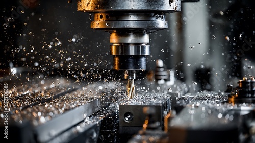Precision Milling Machine Drilling Metal Block with Metal Shavings Flying