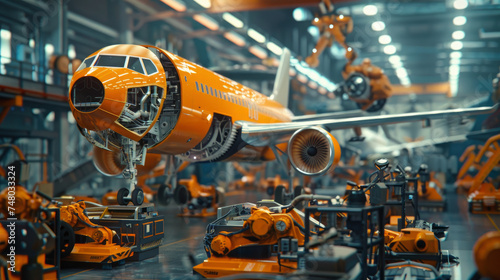 Precision robotics crafting aerospace components in a high-tech factory, 3D animation