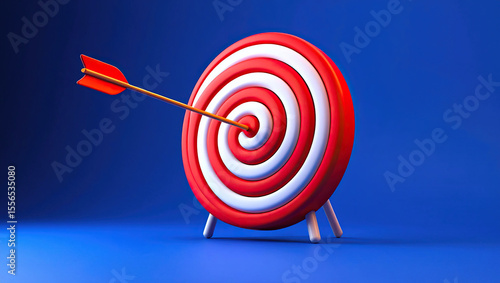 Precision Targeting A 3D Render of a Red and White Target with an Arrow Perfectly Centered on a Blue Background for Strategic Accuracy and Goal Setting