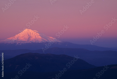 Predawn morning sunrise light on Mount Shasta in late autumn. Photographed on Fuji Velvia 35-mm film.