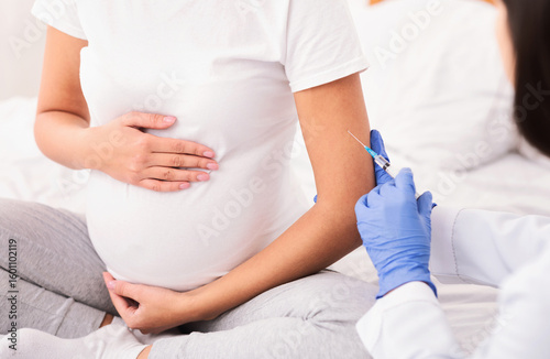 Pregnancy And Vaccination. Unrecognizable Pregnant Lady Patient Receiving Injection In Arm Sitting On Bed Indoor. Cropped
