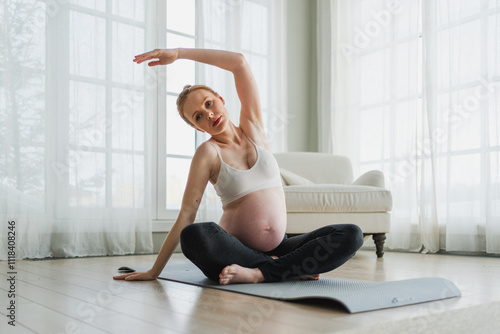 Pregnancy yoga fitness workout training. Pregnant woman practicing yoga at home. Pregnant girl doing sports exercise on yoga mat indoor. Woman with big belly have fitness training practicing asana