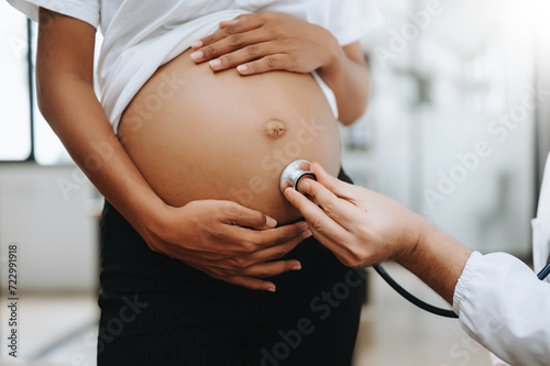 Pregnant african woman has appointment with doctor at clinic. Male gynaecologist OB GYN medic specialist with stethoscope listens to baby's heartbeat in mother's belly. Pregnancy, health care