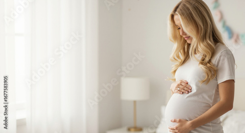 Pregnant blonde woman in white dress touching belly at home. Solo maternity moment for prenatal wellness and pregnancy lifestyle content creation services