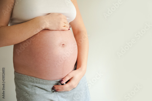 Pregnant cares for her stomach on a gray background close-up and copy space.