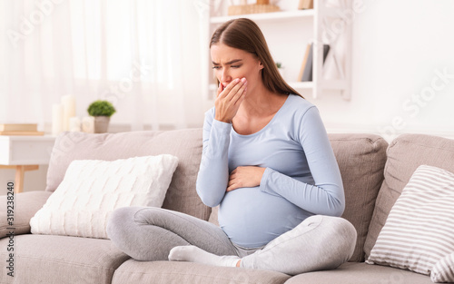 Pregnant Girl Touching Mouth Sitting On Couch Indoor