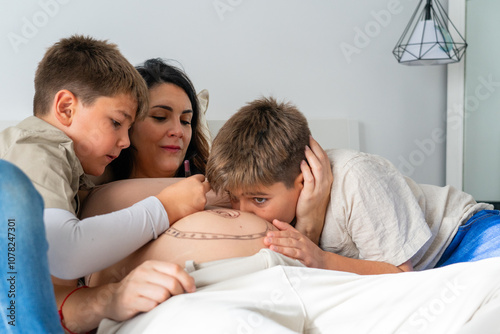 Pregnant mother with her two children, one giving her a kiss on the belly and the other painting the belly