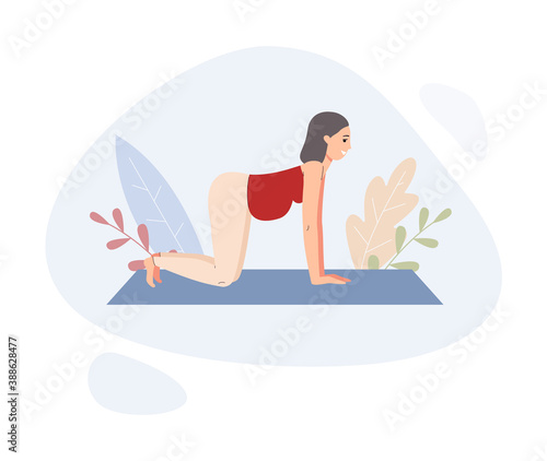 Pregnant woman doing yoga workout, flat vector illustration isolated on white.