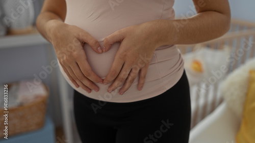 Pregnant woman making heart shape with hands over belly in cozy baby room indoors, highlighting warmth and anticipation of new motherhood at home.