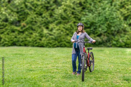pregnant woman on the green lawn in a park holding bicycle ready to ride.